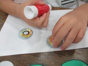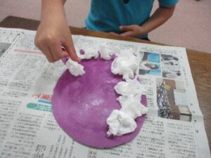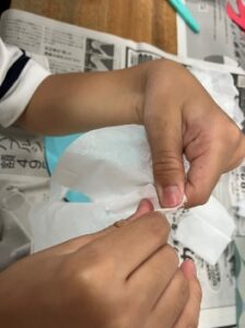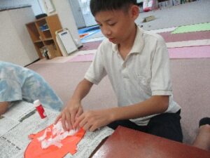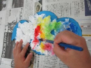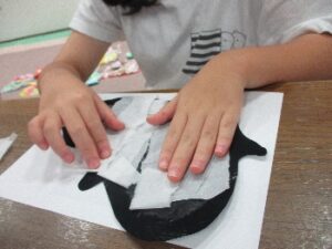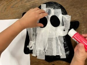 様々な形のオバケを上手に切っていき、その上にのりを塗り、上から丸めたティッシュをぽんぽんと乗せて貼り合わせていきます。