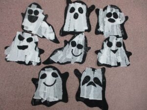 2日目はこのオバケたちが真っ黒なままなのでティッシュで白を表現し、目や口を貼ったらオバケの集合!