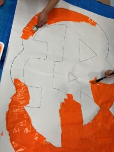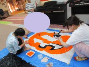 模造紙に大きなカボチャを用意して、子どもたちと絵の具開始~~✨