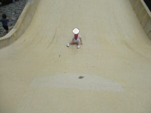 冒険ランドに着くと色々な遊具が… 最初は宣言どおり滑り台からビュン!とひと滑りしてきます。