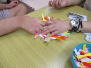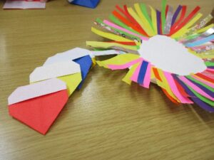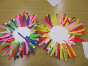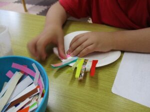 今回は紙皿を台紙にどんどん折り紙を貼り付けていきます。