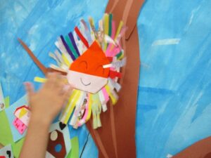 木の下が寂しいので別に作ったきのこも一緒に加わって秋の壁面の完成です。