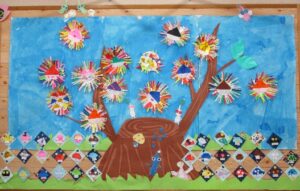 カラフルで、可愛く出来ましたね! できたイガグリを壁面へ貼り付けて…。