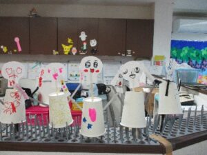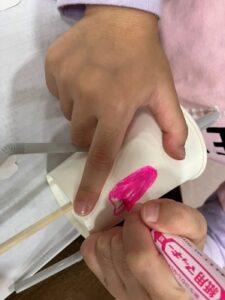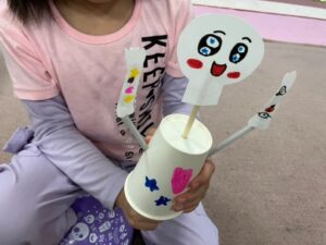 紙コップにストロー、紙皿に割り箸と材料が出て来て・・・子どもたちは
