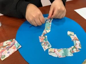 数字を書いた画用紙に千代紙でちぎり絵をしていきますが、