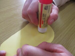 本体、顔、目、ヒゲ…。パーツを作り準備完了。のりを使ってだるまを作っていきます。