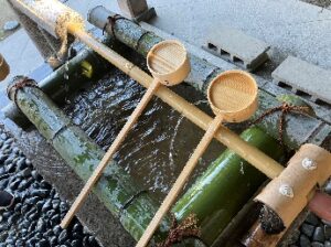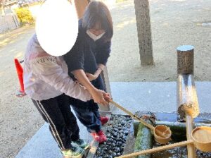 スタッフに柄杓を使って手や口などの洗い方を教えてもらいながら見様見真似でやったり