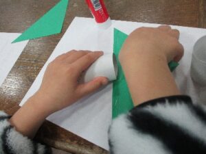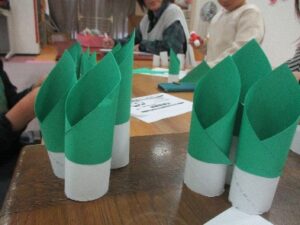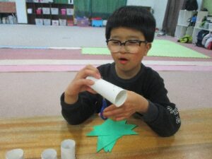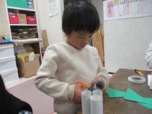 トイレットペーパーの芯を½カットと⅓カットを子どもたちに切ってもらい画用紙で竹のように模様して貼って飾り付けをしました!