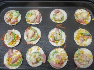 シーチキンにマヨネーズを入れて混ぜたり、ピーマンとウインナーを一口サイズに切ってトッピングをしました。