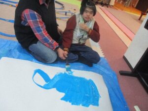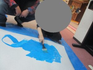 大きな模造紙に たっぷりと絵の具を塗っていきます。