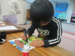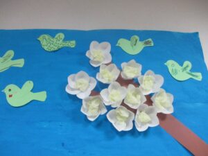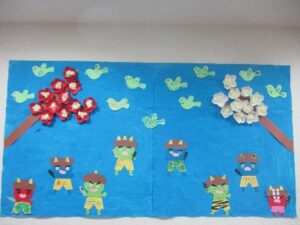 出来上がった鬼👹・梅の花🌸・うぐいす🐤を大きな模造紙の青空に みんなで