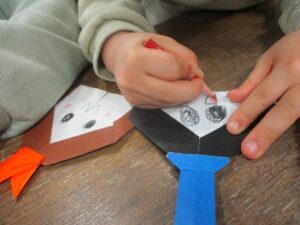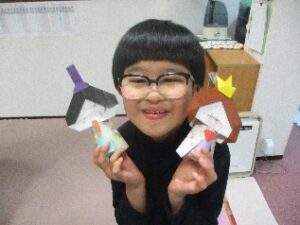 ヤクルトの容器に折り紙を巻いて着物👘お顔を描いて 冠👑や扇子を付けて。