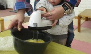 初めてミキサーを使ったのかな? びっくりした表情から無心になって混ぜてくれました!