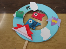 ドーナツ段ボールに水色の紙を貼って空に。あとは作ったパーツをお好みの位置にガンガン貼っていくだけ!