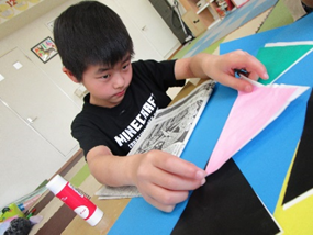 好きな色の折り紙を三角に切り、それを2枚重ねて貼ってウロコに見立てます。